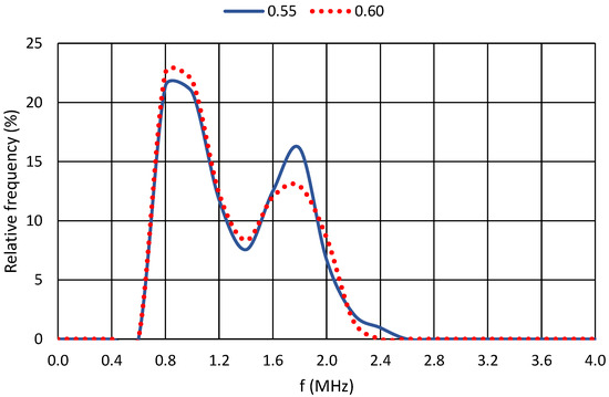 For a further comparison of the results, the relative frequency of the dominant frequencies for each cement paste were selected. For greater clarity, the plots were always produced for two cement pastes with similar water coefficient values. The axes of all graphs are identical. The horizontal axis shows the recorded frequencies in MHz, and the vertical axis shows the relative frequency in percentage. At the same time, the resonant frequency of the piezoelectric elements is shown for all graphs, namely, 850 kHz.