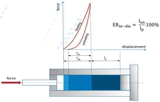 where l24 denotes the height of the pellet after 24 h of relaxation, and lp(10) is the height of the pellet at the maximum pressure of the tenth cycle. Thus, ER24 is the arithmetic sum of ERin-die and ERout-of-die. Due to the different approaches used in the literature, it should be noted that, in both cases, the pellet extension was related to the pellet height at maximum pressure.