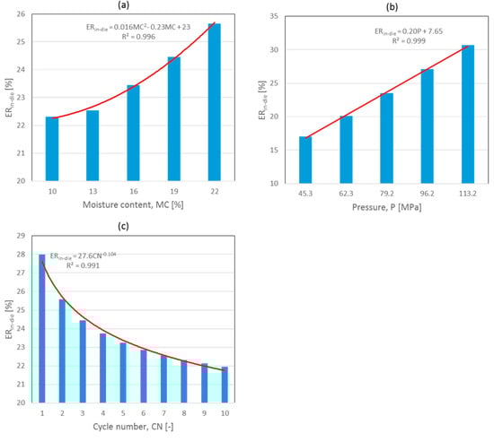 The ERin-die value increased with increasing digestate moisture content and applied pressure. However, it decreased with successive loading cycles. Mathematical functions with high determination coefficients (R2 > 0.991) were used to accurately describe the average changes in elastic recovery. Specifically, a quadratic function was used for moisture content, a linear function for the applied pressure, and a power function for the cycle number (Figure 2).