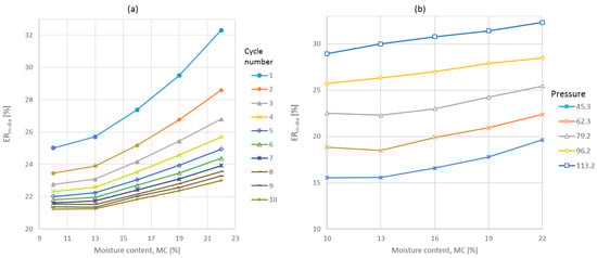 The largest source of variation was noted for the pressure applied, while the errors for moisture and cycle number were similar. All of the analyzed factors significantly influenced the elastic recovery magnitude. The interaction effects of moisture and pressure, and moisture and cycle number were also significant at p < 0.05 [8,9]. The results of these interactions are shown in Figure 3a,b. The most significant changes of ERin-die occurred during the initial five cycles, while for lower moisture contents (10% and 13%) no or little effect was observed. However, a further increase in water content led to a closely linear increase in elastic recovery. With successive cycles, ERin-die exhibited a declining trend that approached an asymptotic behavior. The magnitude of these declines decreased progressively as the cycle number advanced. The influence of moisture content, as depicted in Figure 2a and modeled by a quadratic function, exhibited a clear quadratic relationship at lower pressure values and during the initial loading cycles but displayed a more linear pattern at higher pressure values and throughout subsequent loading cycles.