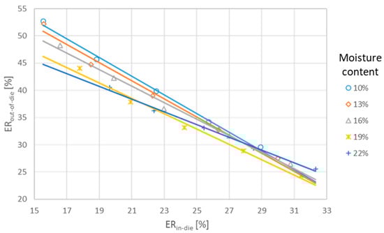 Based on the results of the current study, ERin-die remained relatively constant for moisture contents of 10–13%. In the study presented in this paper, ERin-die increased with increasing moisture contents and pressure values. Interestingly, the elastic recovery after 24 h decreased for pellet samples with increased moisture contents and subjected to increased pressure values. In the latter case, the results obtained are more consistent with those presented in the literature. This indicates that there is a negative correlation between elastic deformation inside and outside the die. This was confirmed by a deeper analysis of this study’s results. The closely linear correlation between ERin-die and ERout-of-die is presented in Figure 4.