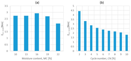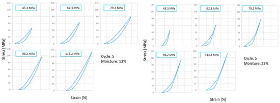 Analysis of the strain hysteresis loops allowed for the identification of differences in the area bounded between the loading and deformation curves. This area decreased for moisture contents higher than 16% and asymptotically with an increasing number of cycles (Figure 6).