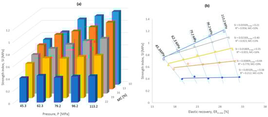 Strength index of pellets for variable pressure values and moisture contents (a), (b) effect of elastic recovery in-die ERin-die on SI values.