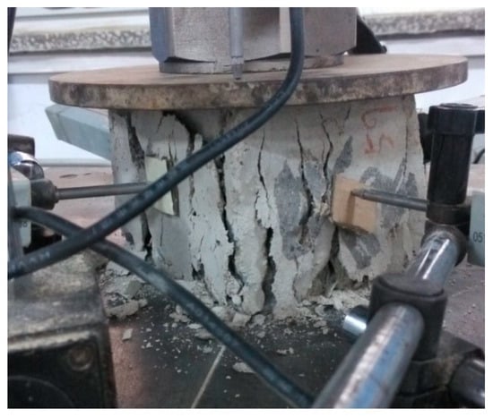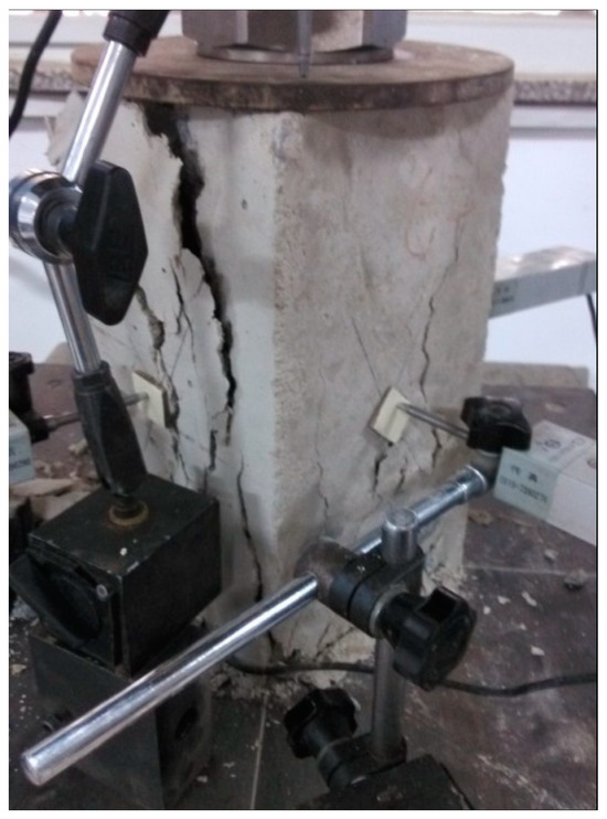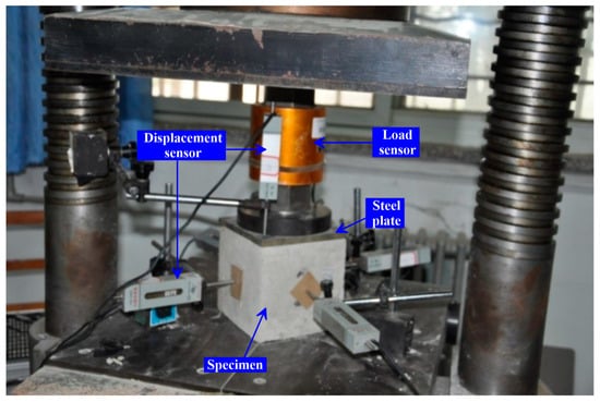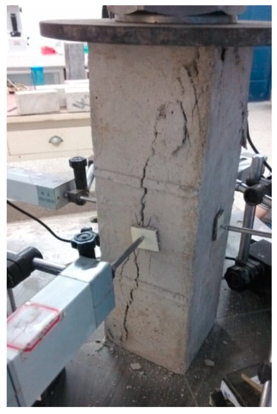 A pressure testing machine (Hebei Zhongke Beigong Test Instrument Co., Ltd., Cangzhou, China) with a range of 200 kN is used in the uniaxial compression test. The specimen of 28 days age was placed in the middle of the upper and lower pressure plates of the testing machine, and the steel plate was placed on the top surface of the specimen. The axial displacement of the specimen is measured by an electronic displacement meter installed on the upper part of the steel plate, and the lateral displacement is measured by four electronic displacement meters (erected perpendicular to the four sides of the specimen). The load sensor is placed between the steel plate and the upper pressure plate of the testing machine to measure the load data. The load and displacement data are imported into the computer. After the test instruments are correctly installed in place, the test machine is started, and the loading rate is controlled to be 0.01 mm/min until the specimen is failure. The uniaxial compression test is shown in Figure 1.