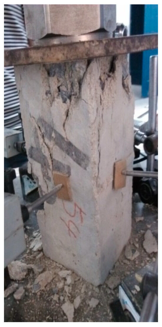 The failure of the specimen with the size of 150 mm × 150 mm × 300 mm and the height–width ratio of 2 is shown in Figure 6. There is a wide oblique crack on the surface of the specimen. The crack penetrates from the top of the specimen to the bottom. The widest part of the crack is about 3 cm, and the deepest part can be up to 3–4 cm. The two oblique cracks in the adjacent surface have been penetrated, and the failure of the specimen is extremely serious. Large amounts of coarse aggregate fall off. The top of the specimen shows the most severe failure, the bottom is relatively complete, and the shear failure characteristics are obvious. The overall integrity of the specimen after failure is more complete than that of the specimen with a size of 100 mm × 100 mm × 200 mm.