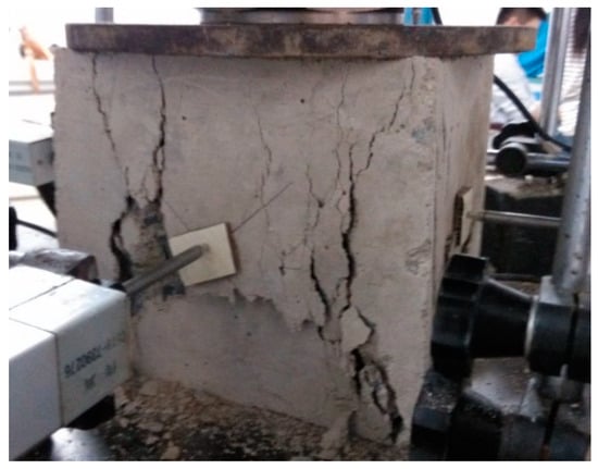 The failure of the specimen with the size of 150 mm × 150 mm × 150 mm and the height–width ratio of 1 is shown in Figure 5. The oblique cracks on the surface of the specimen are formed by the oblique expansion and penetration of multiple vertical cracks. The width and depth of the crack are large, extending from the four top angles to the center of the specimen. The surface of the specimen is seriously peeled, and the coarse aggregate at the crack is exposed and separated from the cementitious material. The overall failure of the specimen is more serious, and the overall integrity is more complete than the specimen with a size of 100 mm × 100 mm × 100 mm.