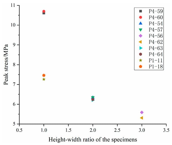 The peak stress of the specimens with five sizes under uniaxial compression is shown in Table 6 and Figure 7. When the bottom width of the specimen is 100 mm and the height is 100 mm, 200 mm, and 300 mm, the average peak stress is 10.66 MPa, 6.34 MPa, and 4.45 MPa, respectively. When the bottom width of the specimen is same, with the increase in the height–width ratio, the peak stress of the specimen decreases gradually, with a decrease of 40.5% and 29.8%, respectively, and the decrease is greatly reduced. When the height–width ratio is the same, the peak stress of the specimen decreases with the increase in the overall size. When the height–width ratio of the specimen is 1, the peak stress of the cube specimen with a side length of 100 mm, 150 mm is 10.66 MPa, and 7.36 MPa, respectively, and the strength is reduced by 30.9%.