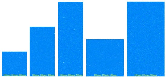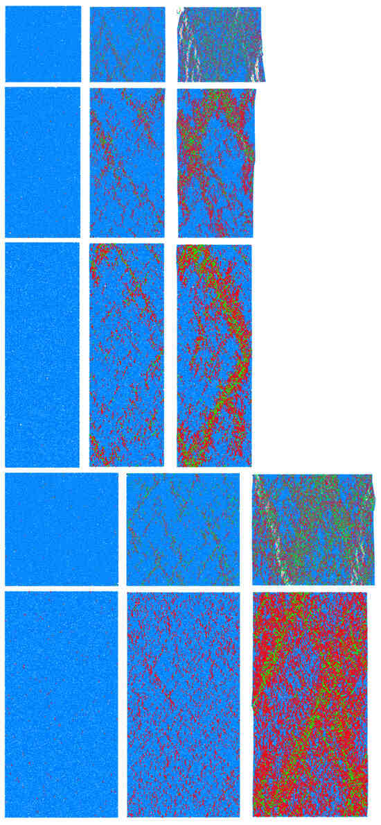 In Figure 13, the sequence from left to right is the crack evolution process in the model at 0.5 times the peak stress, the peak stress, and the post-peak residual stress of 0.5 times the peak stress. Red represents tensile cracks, and green represents shear cracks. The result of numerical simulation is that at 0.5 times the peak stress, there are only a few tensile cracks in the model. At the peak stress, there are more tensile cracks and a small amount of shear cracks in the model. At the post-peak residual stress of 0.5 times the peak stress, the failure of different size models is quite different. The failure mode of the model with the size of 100 mm × 100 mm × 100 mm is mainly tensile. There are many tensile cracks parallel to the compression direction, which are extended and penetrated. The overall failure of the model is very serious. There are a large number of shear cracks concentrated on the top of the model in the model with a size of 100 mm × 100 mm × 200 mm, and failure of the top of the model is serious. There are few cracks at the bottom of the model, and most of them are tensile cracks. The overall integrity of the model after failure is more complete than that of the model with a size of 100 mm × 100 mm × 100 mm. There is an obvious oblique crack in the model with the size of 100 mm × 100 mm × 300 mm, which is mainly shear crack and penetrates from the top to the bottom of the specimen, and the shear failure characteristics are obvious. The overall integrity of the model after failure is more complete than that of the model with a size of 100 mm × 100 mm × 200 mm. There are a large number of tensile and shear cracks in the model with the size of 150 mm × 150 mm × 150 mm. The large-scale macroscopic penetrating cracks formed by the expansion of tensile cracks. Compared with the model with a size of 100 mm × 100 mm × 100 mm, the overall integrity of the model after failure is more complete. There is a large number of tensile cracks with uniform distribution in the model with the size of 150 mm × 150 mm × 300 mm, and shear cracks with concentrated distribution and form large-scale oblique cracks. Compared with the model with a size of 100 mm × 100 mm × 200 mm, the overall integrity of the model after failure is more complete.