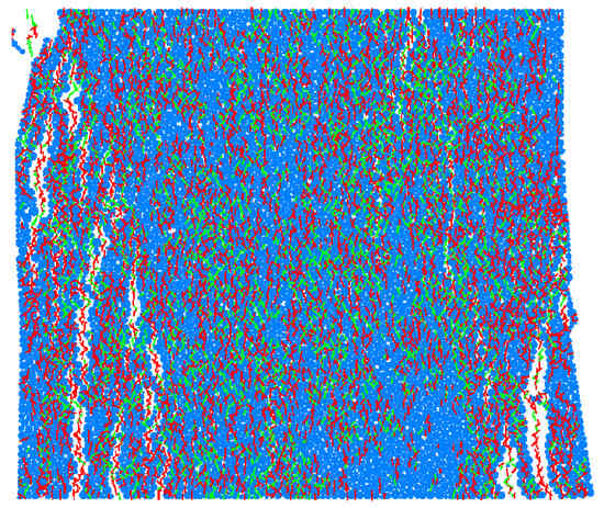 Taking the specimen with a size of 100 mm × 100 mm × 100 mm as an example, the final failure mode of the specimen obtained by numerical simulation is shown in Figure 11, where red represents tensile cracks and green represents shear cracks. Vertical cracks are dense and are present throughout the model. When the specimen is a failure (i.e., after peak stress), tensioning cracks are predominant, with a small number of shear cracks. The overall damage to the model is serious, and some spheres have separated from the model. The numerical simulation is basically consistent with the experiment (Figure 11). The stress–strain curve obtained from numerical simulation is shown in Figure 12, and its peak strength and deformation modulus are basically consistent with the experiment. The curve shape is in good agreement with the experimental curve. It shows that the model parameters used in this numerical simulation are reasonable and can be used to simulate this experiment.
