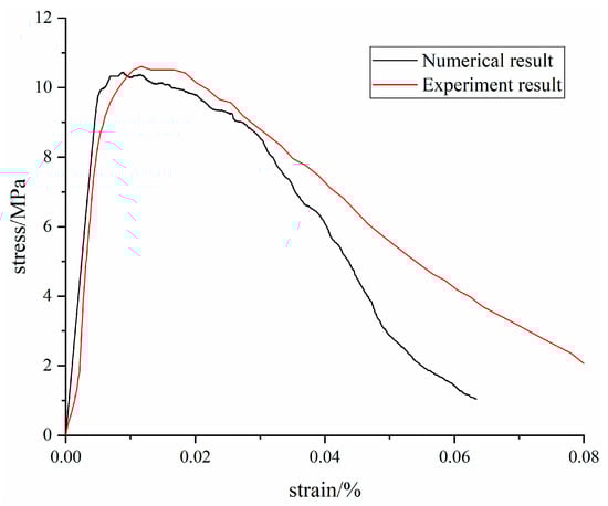 Using the same testing method and loading conditions as indoor experiments, the stress–strain curve obtained in the PFC2D program was verified, and the microscopic parameters suitable for PFC2D simulation were obtained, as shown in Table 7.