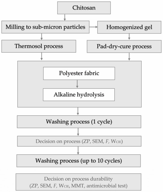 The submicron particles of chitosan were applied to polyester fabrics by the thermosol process, similar to the disperse dyeing process. Fabrics were impregnated (padded) in water suspension of 3 g/L chitosan on Foulard (Kovinar, Zagreb, Croatia) with WP 100%, dried at 110 °C for 2 min, followed by impregnation in 0.5 mol/L acetic acid with WP 100%, then dried again at 110 °C for 2 min. Thermosoling (thermocondensation, curing) was performed at 190 °C for 40 s. Drying and curing were performed on a Benz continuous dryer.