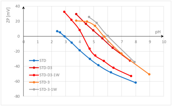 Another thing can be observed. Polyester fabrics were activated by alkali hydrolysis accelerated with hexadecyltrimethylammonium chloride (HDTMAC). After hydrolysis, the fabrics were rinsed only once with hot water to remove the oligomers, so there is a high probability that desorption did not take place and some amount of HDTMAC was adsorbed onto the polyester fabric (according to the literature, this may be about 0.01 mmol/g [66]). Even this small amount of cationic surfactant can increase the ZP (ZP at pH 7 for STD is −55.5 mV and for STD-H is −50.1 mV; ZP at pH 6 for STD is −46.7 mV and for STD-H is −35.1 mV; ZP at pH 5 for STD is −35.2 mV and for STD-H is −20.1 mV; etc.) and shift the IEP to a higher pH value; IEP for STD-H is 3.4.