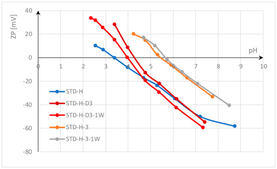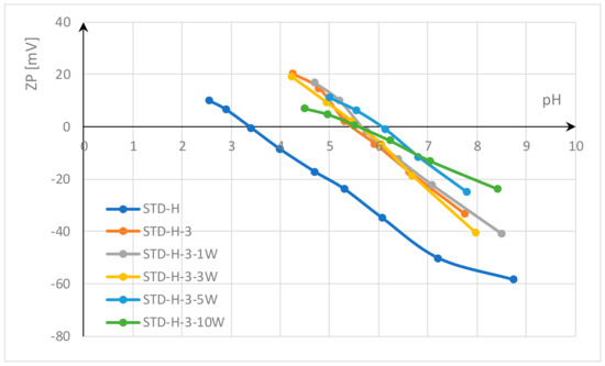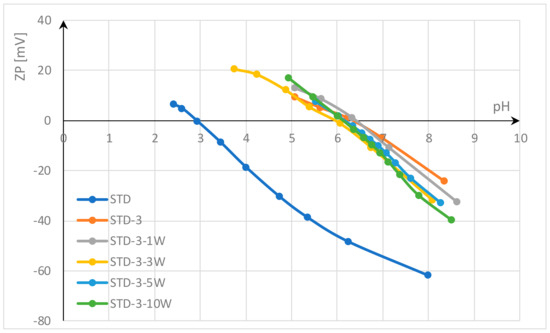 The electrokinetic potential (zeta potential, ZP) was calculated according to the Helmholtz–Smoluchowski equation after measuring the streaming potential with a SurPASS electrokinetic analyzer (Anton Paar GmbH, Graz, Austria) using an Adjustable Gap Cell [57,58]. For each point, the streaming potential was measured 8 times at each pH value, with 2 parallel samples. An electrolyte solution of 0.001 mol/L KCl solution was used for measurement in the pH range from pH 9 to pH 2, and the Isoelectric point (IEP) was determined.