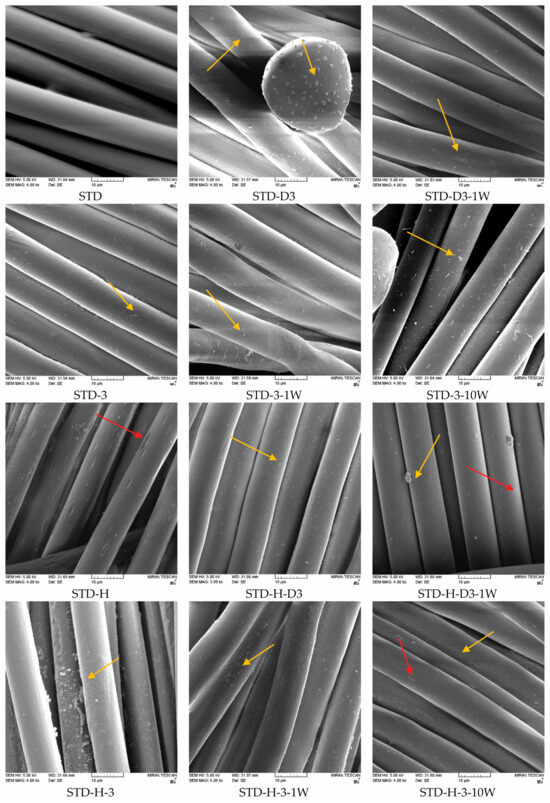 SEM micrographs of standard (STD) and hydrolyzed (STD-H) fibers in polyester fabrics at a magnification of 4000×, after chitosan functionalization (–3), 1 and 10 washing –W, –10W) cycles. Yellow arrows: chitosan, red arrows: pits.