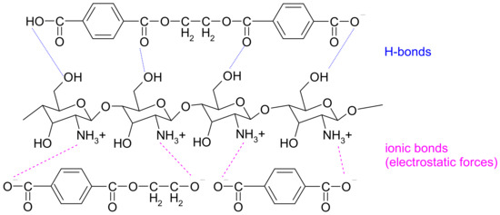 In view of the results presented and the durability of the chitosan functionalization treatment after the first washing cycle with a non-ionic surfactant, functionalization with chitosan homogenized in acetic acid solution by the pad-dry-cure process proved to be more favorable than the thermosol process with dispersion of submicron chitosan particles. It can be assumed that only H-bonds are present in the thermosol process, while ionic bonds also occur between protonated chitosan and polyester fiber in the pad-dry-cure process (Figure 5).