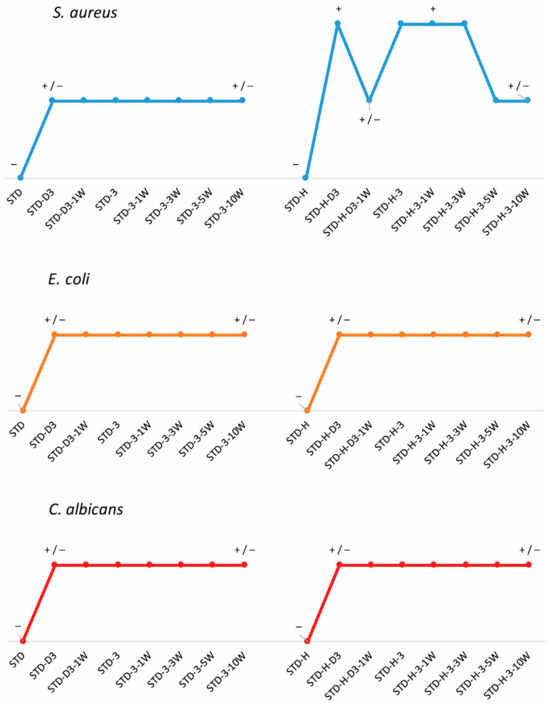 The antimicrobial activity of fabrics before and after functionalization with chitosan and 1 and 10 washing cycles was determined according to AATCC TM 147-2016 against the following microorganisms: the Gram-positive bacterium Staphylococcus aureus (S. aureus), the Gram-negative bacterium Escherichia coli (E. coli) and the microfungus Candida albicans (C. albicans). The results are presented in Figure 8.