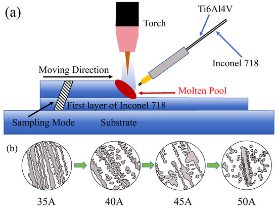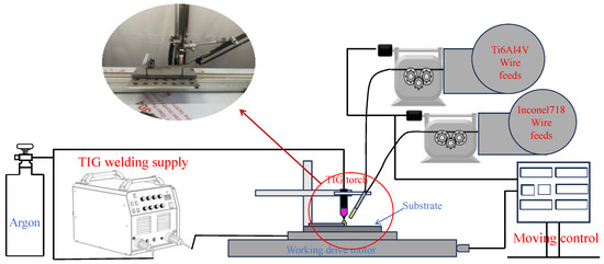 The experiment adopts a single arc deposition system, which mainly includes a TIG welding machine, servo motor mobile platform, and wire feeding mechanism. The working principle is shown in Figure 1. The Ti6Al4V and Inconel 718 wires are heated by an arc heat source. The two wires are placed on one side and the wire feeder can achieve different wire feed speeds. The system uses 99.99% high-purity argon as the protection gas.