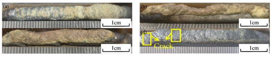 To determine the appropriate process parameters, the ratio of two types of welding wire is adjusted by varying the speed of the wire feeder. After fixing the wire feeding speed for both types of welding wire, different deposition currents are applied to prepare the sediment. Figure 2 shows the deposition morphologies under different deposition currents. As the current increases, the roughness of the deposited layer also increases significantly, primarily due to the increase in the viscosity of the liquid metal. Van et al. [25,26] studied the relationship between heat input and forming quality, and the results showed that the lower the heat input, the smoother the surface of the sedimentary components. This is consistent with the morphology of the samples deposited in this work. At higher cooling rates, the wettability and diffusivity of liquid metals are reduced, resulting in poorer adhesion. Furthermore, when the current reaches 50 A, cracks appear on the surface of the layer.