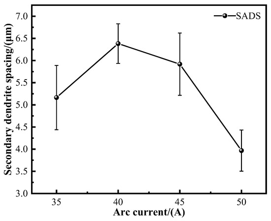 The microhardness of the composite increases with the increase in the deposition current. The secondary phase precipitation will also affect the microhardness of the composite. When the deposition current is small, the secondary phases such as Ti-Cr and Ti-Fe in the composite are less precipitated. When the deposition current increases, more secondary phases are generated, which increases the microhardness of the composite. In addition, the dendrites of the material are often filled with crystals with high solute content, resulting in segregation, which will affect the mechanical properties of the alloy, and the smaller the dendrite spacing, the more favorable the alloy properties [43]. The secondary dendrite spacing of composites produced under different deposition currents shows some variability. As illustrated in Figure 6, the secondary dendrite spacing initially increases with the deposition current and then decreases at higher currents. Concurrently, the microhardness of the composites also increases with the deposition current. At deposition currents of 35 A and 40 A, the secondary dendrite spacing increases, and the microhardness of the composites rises as well. This increase in microhardness at 40 A is attributed to a greater amount of secondary precipitates forming within the material, which enhances its properties. For deposition currents of 40 A and 45 A, the secondary dendrite spacing remains relatively constant, leading to similar microhardness values. However, when the deposition current reaches 50 A, the secondary dendrite spacing is reduced, and the precipitation of secondary phases is significantly higher, resulting in the highest microhardness observed.