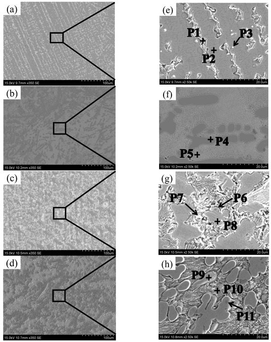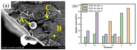 Figure 7d illustrates the microstructure of the sample sediment obtained with a deposition current of 50 A, while Figure 7h provides a local magnification. From Figure 7h, it can be observed that numerous acicular structures are present between the dendrites. According to the EDS scanning results, the atomic contents of Ti and Ni in the intergranular acicular structure are 22.94 at% and 45 at%, respectively. The atomic ratio of Ni to Ti is approximately 2:1. Together with the X-ray diffraction analysis results, it can be concluded that the needle structure is likely a nickel-rich TiNi phase. At the position of the precipitated phase P9, the atomic ratio of Ti to Ni is approximately 1:1, and the atomic contents of Cr and Fe are similar. It can be inferred that the precipitated phase may be a eutectic structure composed of Ti, Ni, Cr, and Fe elements, potentially forming brittle intermetallic compounds such as TiNi, Cr2Ti, and Fe2Ti. At position P11 in Figure 7h, a black precipitated phase can be observed on the dendrite axis. According to the EDS scanning results, the carbon content at P11 is higher than that of the other elements. This may be attributed to excessive heat input, leading to the partial diffusion of MC carbide into the grain during solidification. It has been reported that a small amount of MC carbide can inhibit dislocation movement and stabilize grain boundaries, thereby strengthening the material. However, an excessive amount of MC carbide can cause stress concentration and reduce the durability of the alloy [15]. When the deposition current reaches 50 A, cracks begin to appear in the sedimentary layer. This may be attributed to the stress concentration caused by the accumulation of MC carbides, as shown in Figure 2d. A detailed analysis of the crack section will be provided in the following section.