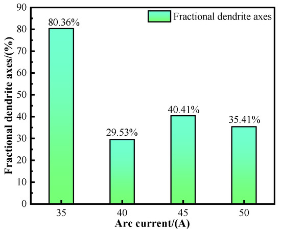 According to SEM-EDS analysis, the Ni content along the dendrite axis is higher than the Ti content under various deposition currents, while the Ti content along the dendrite axis increases with the rising deposition current. Figure 8 illustrates the proportion of the dendrite axis. At a deposition current of 35 A, the dendrite axis proportion reaches a maximum of 80.36%. However, this proportion decreases overall as the deposition current increases. A comparison of the element content in the interdimeric and dendritic regions reveals that, with an increasing deposition current, the alloying element concentrations in these two areas become more similar, indicating a trend toward a more uniform phase distribution.