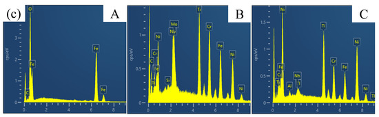 To investigate the phase composition of the crack section, an EDS scanning analysis of its microstructure was conducted. Figure 10 presents a high-magnification SEM image of the fracture bottom, revealing a precipitated phase A. EDS analysis indicates that the atomic ratio of oxygen to iron is approximately 1.6:1, suggesting that the precipitate is likely iron oxide. At position B, the ratio of nickel to titanium atoms is about 1:1, with the chromium and iron content being similar to that of titanium and nickel. However, the carbon content is relatively high, leading to the speculation that the main phase at position B is MC carbide. Previous studies have shown that small amounts of MC carbide can impede dislocation movement and stabilize grain boundaries, thus providing strengthening; however, excessive MC can result in stress concentration, reducing the alloy’s durability and contributing to crack formation [15]. At position C, the nickel atom content is highest, with titanium, chromium, and iron content being comparable. This leads to the speculation that the phase at this position may be a eutectic structure of brittle intermetallic compounds formed by Ni, Ti, Cr, and Fe.