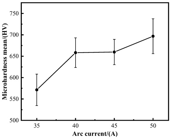 - The hardness data indicate that the microhardness of the sample increases with the current. Specifically, when the current rises to 50 A, the microhardness shows a 31.51% increase compared to the value at 35 A.