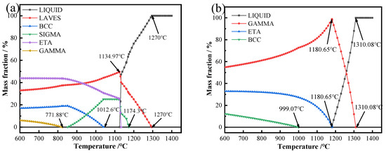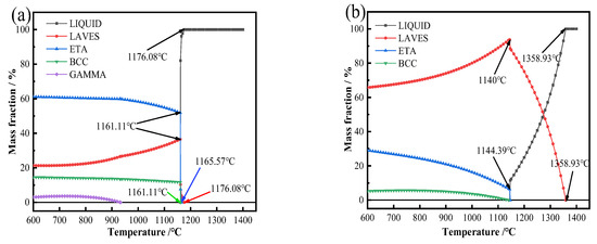 The equilibrium phase diagram of multicomponent alloy and the fraction of phase equilibrium at each temperature can be calculated by the thermodynamic calculation principle [36]. Although there is a deviation between the non-equilibrium heating and cooling process and the theoretical temperature in the equilibrium state, the relative magnitude relationship between each temperature is unchanged, so the theoretical temperature in the equilibrium state can be used to analyze the solidification and precipitation of each phase in the cooling process.