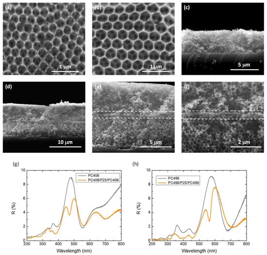 SEM images of the (a) PC406 and (b,c) PC499 inverse opal substrates as well as (d–f) cross-sections of the PC406/P25/PC406 trilayer photonic films at different magnifications. Specular reflectance (R%) spectra for the (g) PC406/P25/PC406 και (h) PC499/P25/PC499 in comparison to the monolithic PC406 and PC499 inverse opals.