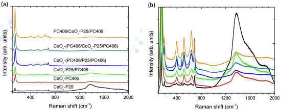 Raman spectra of the trilayer films CoOx-PC406/P25/PC406, PC406/CoOx-P25/PC406, and CoOx-PC406/CoOx-P25/PC406 in comparison to CoOx-P25/PC406, CoOx-PC406 and CoOx-P25 reference films at 785 nm and different intensity scales (a,b). Shaded bands indicate the Co3O4 Raman modes.