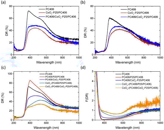Diffuse (DR%) reflectance spectra for the mono-, bi-, and tri-layer photonic films: (a) PC406, CoOx-P25/PC406, PC406/CoOx-P25/PC406 and (b) PC499, CoOx-P25/PC499, and PC499/CoOx-P25/PC499. (c) DR% and (d) the corresponding Kubelka–Munk F(DR) absorbance spectra of the PC406/CoOx-P25/PC406, CoOx-PC406/P25/PC406, and CoOx-PC406/CoOx-P25/PC406 trilayer films in comparison to the PC406 and PC406/P25/PC406 reference ones.