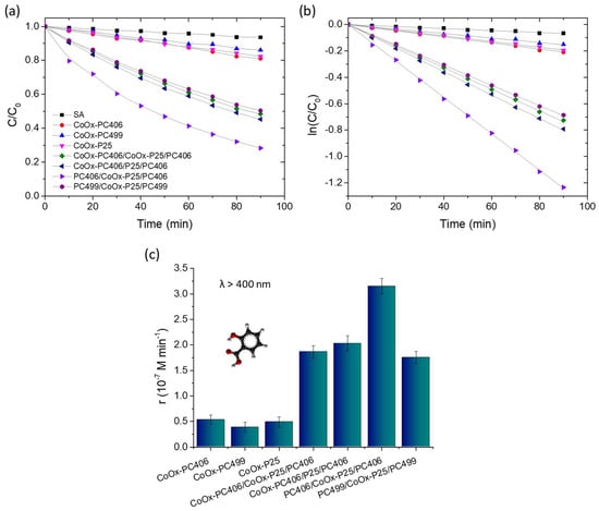 The photocatalytic performance of the trilayer photonic films compared to their constituent monolithic layers was evaluated in the photodegradation of SA under visible light irradiation (λ > 400 nm), using aqueous solutions with pH = 3 that favor the chemisorption of SA on TiO2 and its direct oxidation via photoinduced holes []. All the trilayer films showed a strong photocatalytic activity in the degradation of SA, whose concentration (C) was determined from the absorption peak at 300 nm, which decreased gradually with irradiation time, as shown in Figure 5a. In all cases, the variation in ln(C/C0) with time t presented a linear dependence, where C0 was the initial concentration of SA at t = 0 after its adsorption on the films’ surface in the dark for 30 min, showing that the photocatalytic reaction follows first-order kinetics (Figure 5b). Figure 5c shows the change in the reaction rates r = kC0, which were determined from the kinetic constants k obtained from the slopes of the linear plots ln(C/C0) vs t and the corresponding C0 values. The surface-modified PC406/P25/PC406 films presented significantly higher reaction rates than the sum of the respective rates of the constituent reference CoOx-P25 and CoOx-PC406 films, regardless of the processing step in which the CoOx deposition was carried out.