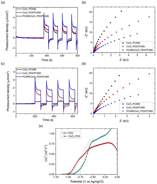 Transient photocurrent density and EIS Nyquist plots in 0.5 Μ NaOH electrolyte under visible light illumination for the mono-, bi-, and tri-layer films (a), (b) CoOx-PC406, CoOx-P25/PC406, PC406/CoOx-P25/PC406, and (c), (d) CoOx-PC499, CoOx-P25/PC499, PC499/CoOx-P25/PC499. (e) Mott–Schottky plots for the P25 και CoOx-P25 films at 1000 Hz.