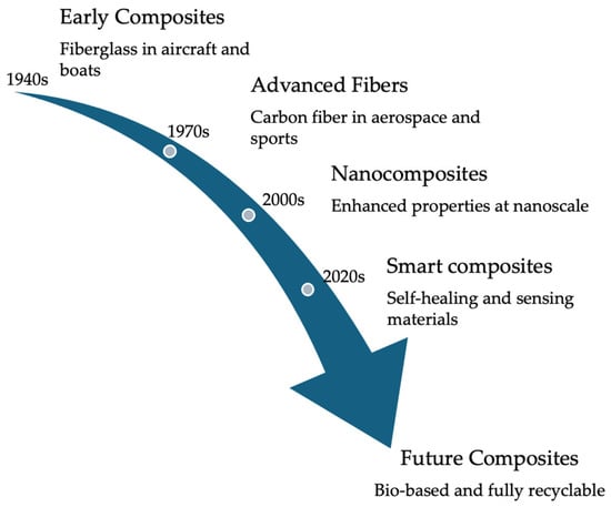 The evolution of composite materials has enabled the production and development of modern advanced materials that can be used in the aerospace, automotive, and many other sectors, showcasing significant advantages. Figure 1 illustrates the evolution of composites. Significant advancements in composites have occurred since 1940 due to industrial and technological demands, particularly in the aerospace, automotive, and energy sectors. This evolution can be described in stages that reflect the development of materials, manufacturing techniques, and applications. For example, in the 1970s, the development and commercialization of carbon fibers represented a breakthrough. These materials offered high strength, stiffness, and low density, making them ideal for applications where weight reduction was critical, such as in the aerospace and defense industries. The use of fiber-reinforced polymers, such as fiberglass, expanded considerably. These composites were widely used in boats, aircraft, and structural components due to their corrosion resistance and high strength-to-weight ratio. In the 1980s, fiber-reinforced polymers, such as carbon fiber and fiberglass composites, were widely adopted in sports vehicles and architectural structures due to their durability and design flexibility. The 1990s saw the integration of advanced materials with the development of metal matrix composites (MMCs) and ceramic matrix composites (CMCs). Advances in surface treatments and interface engineering improved adhesion between fibers and the matrix, enhancing overall performance. A significant development in the 2000s was the development of nanocomposites. They were made by mixing carbon nanotubes and graphene into polymer matrices. This made it possible to make composites with great properties like high strength and good thermal and electrical conductivity. The 2010s focused on greater sustainability and developing composites with sensing and adaptive response capabilities, which were integrated into intelligent systems, such as materials used in aircraft and infrastructure. The continuous integration of nanotechnology, advanced manufacturing, and sustainable design promises a more versatile future for these materials [16].