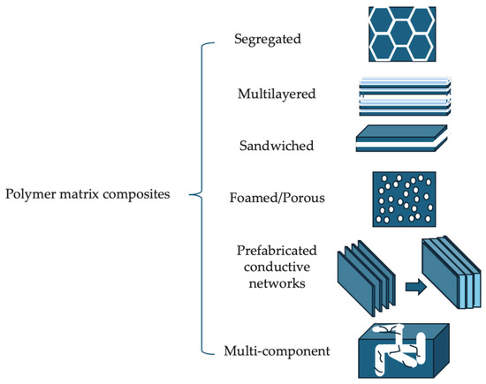 Recent developments in PMCs focus on enhancing their multifunctional properties, such as electrical conductivity and self-healing capabilities, by incorporating nanomaterials like carbon nanotubes and graphene. Additionally, research efforts aim to improve their environmental sustainability, with bio-based polymers and natural fibers being explored as alternatives to traditional petroleum-based materials. Advances in PMCs have significantly transformed various industries, particularly in electronics, aerospace, and biomedical applications. These advancements are primarily driven by incorporating innovative fillers and developing novel processing techniques that enhance PMCs’ mechanical, thermal, and electrical properties [28,29]. Figure 3 shows the designs offer diverse strategies for balancing conductivity, mechanical strength, and weight, providing a comprehensive overview of the potential applications of these materials in various industries.