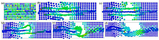 Stress distribution of three-layer graphene/aluminum composite during tensile failure. (a–f) illustrates the sequence of events, from the initial formation of cracks in the matrix to the eventual failure of the material during stretching [42].