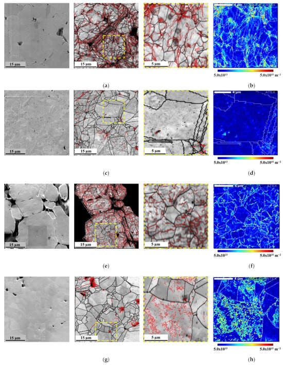 SEM images and IQ maps with high- and low-angle boundaries (black and red, respectively) delimited and geometrically necessary dislocation (GND) density maps for (a,b) Ni green compact, (c,d) sintered Ni, (e,f) Ni-CNT green compact, and (g,h) Ni-CNT sintered samples [44].
