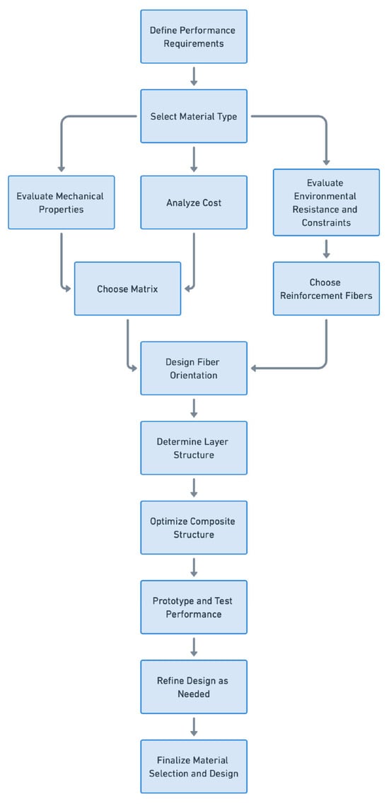 Furthermore, the advent of eco-friendly composites, which utilize biodegradable materials and natural fibers, is reshaping the landscape of composite design. These materials offer reduce environmental impact and maintain competitive mechanical properties, making them suitable for various applications [96]. Integrating biocomposites into product design reflects a broader trend toward sustainability in engineering practices, highlighting the importance of selecting materials that align with environmental considerations. Figure 9 shows the flowchart representing the selection and optimization of the material for advanced high-performance composites. This flowchart illustrates a systematic approach to composite material design, ensuring all factors like performance, environmental conditions, cost, and structural requirements are addressed to create a robust and optimized composite structure. One branch of the flow evaluates the mechanical properties essential for the application, such as strength, stiffness, and toughness. The design of the composite structure is optimized, integrating all previous decisions to maximize performance within constraints. The other branch optimizes the material layout and processing conditions to improve manufacturability and reduce costs.