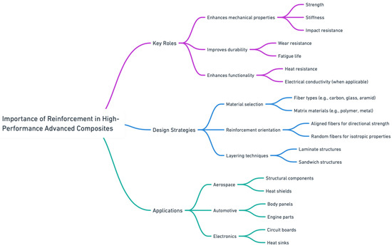 The importance of reinforcement in the materials selection and design strategies of high-performance advanced composites cannot be overstated. Figure 10 shows a flowchart representing the materials selection and optimization for advanced high-performance composites. The reinforcement is critical in enhancing composite materials’ mechanical properties, durability, and functionality, which are increasingly utilized in various high-tech applications, including aerospace, automotive, and electronics. Carbon fibers are widely used in high-performance composites due to their excellent strength-to-weight ratio, high stiffness, and thermal stability. They are commonly used in aerospace, automotive, and sporting applications where lightweight materials with superior mechanical properties are critical. Carbon fibers also offer good fatigue resistance, making them ideal for long-term, load-bearing applications.