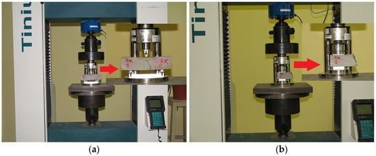 Testing of hardened mortar samples: (a)—flexural strength; (b)—compressive strength.