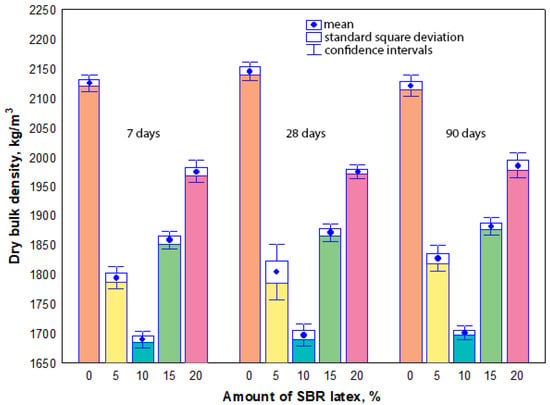The authors in [] also observed tendencies similar to our results. The compressive and flexural strengths of modified mortar samples containing 7–10% SBR latex were directly proportional to the apparent bulk density. The growth in the apparent bulk density values of modified mortar samples was observed when the amount of SBR latex was from 10% to 20%. The properties of SBR latex-modified mortar samples were influenced by the film thickness of SBR latex, Portland cement hydrates, and the formed structure between the organic and inorganic phases.
