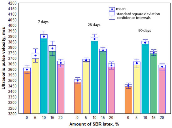 - The maximum increase in the arithmetic mean of ultrasonic pulse velocity values was found in the mortar samples containing 10% SBR latex. Depending on the curing time of these samples, it was 8–10% higher than the arithmetic mean of ultrasonic pulse velocity values of the mortar samples without SBR latex;