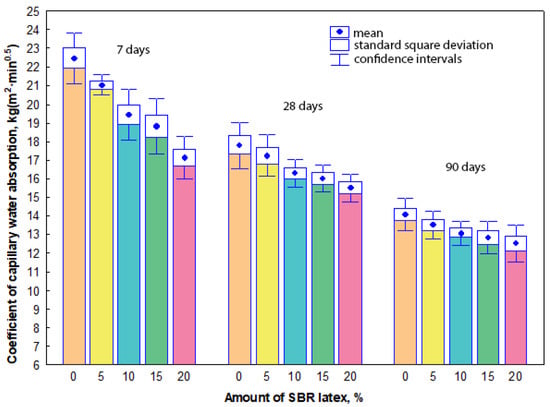 - The maximum decrease in the arithmetic mean of the coefficient of capillary water absorption values was found in the mortar samples containing 20% SBR latex. Depending on the curing time of these samples, it was 24–11% lower than the arithmetic mean of the coefficient of capillary water absorption of mortar samples without SBR latex;
