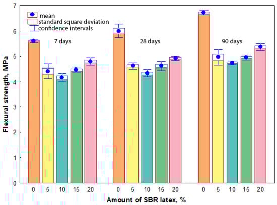 - The maximum decrease in the arithmetic mean of the flexural strength values was found in the mortar samples containing 10% SBR latex. Depending on the curing time of these samples, it was 25–29% lower than the arithmetic mean of flexural strength values of the mortar samples without SBR latex. Statistical analysis has shown that after 7, 28, and 90 days of hardening, the variation in the flexural strength values of modified mortar samples at an average of 86%, 84%, and 75% depends on dry bulk density values;