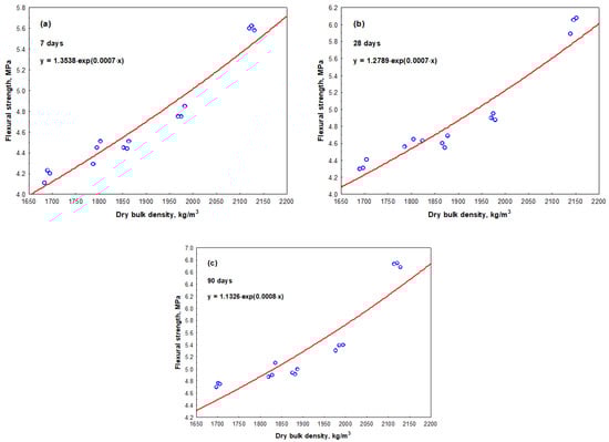 Relationship between the flexural strength and dry bulk density of the mortar samples: (a)—after 7 days; (b)—after 28 days; (c)—after 90 days.