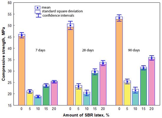 - The maximum decrease in arithmetic mean of the compressive strength values was fixed in the mortar samples with the amount of SBR latex of 10%. Depending on the curing time of these samples, it was 48–58% lower than the arithmetic mean of compressive strength values of the mortar samples without SBR latex. Statistical analysis has shown that the variation in the compressive strength values of modified mortar samples after 7, 28, and 90 days of hardening, at an average of 92%, 97%, and 96%, depends on the dry bulk density values;