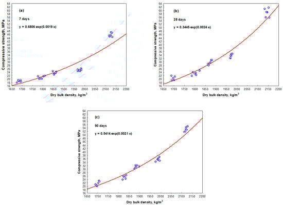 Relationship between the compressive strength and the dry bulk density of mortar samples: (a)—after 7 days; (b)—after 28 days; (c)—after 90 days.