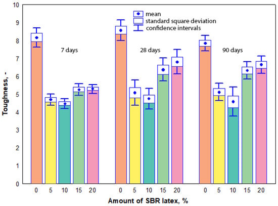 - The maximum decrease in the arithmetic mean of toughness values was found in the mortar samples containing 10% SBR latex. Depending on the curing time of these samples, it was 46–37% lower than the arithmetic mean of toughness values of the mortar samples without SBR latex;