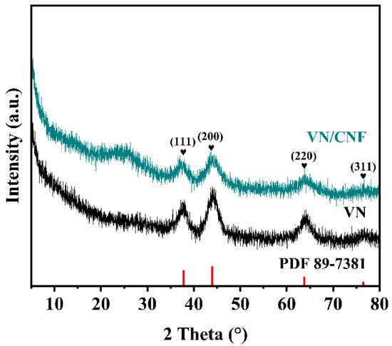 The composition and structures of the VN/CNF and VN samples were characterized by X-ray diffraction (XRD). As illustrated in Figure 2, the diffraction peaks of VN/CNF and VN at 27.6°, 43.7°, 63.6°, and 76.3° can be effectively aligned with the standard PDF card 89-7381, which corresponds to the (111), (200), (220), and (311) crystal planes of VN, respectively. In comparing VN with VN/CNF, the former displays a protruding drum peak at approximately 25°; this peak aligns with the carbon fiber skeleton obtained through the heat treatment process of PAN.