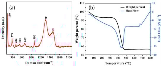 (a) Raman spectra and (b) TG-DSC curves of VN/CNF.